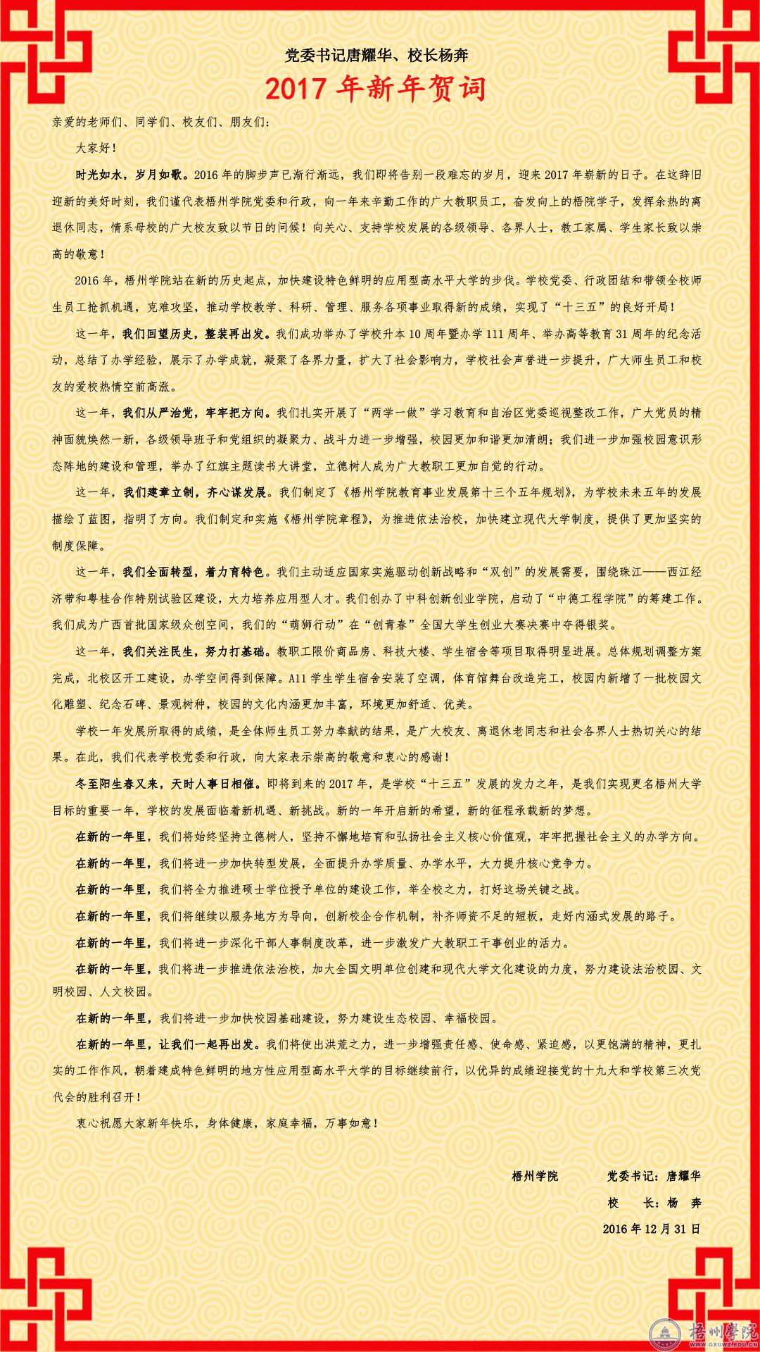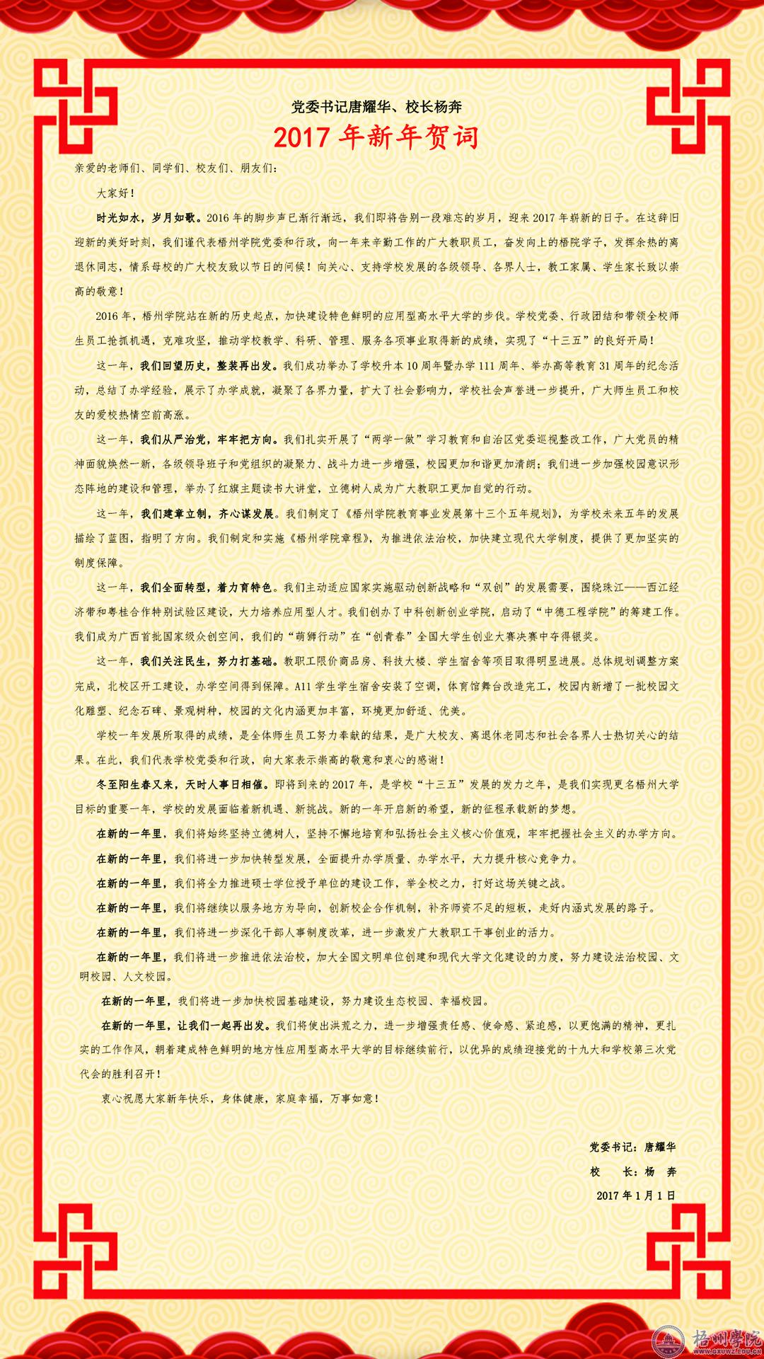 党委书记唐耀华、校长杨奔 2017年新年贺词