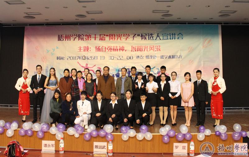 本次评选活动从2016年10月8日启动,经各二级学院推荐、初选、候选人现场宣讲、专家评审等环节,最后评选出梁凯文等10名同学为我校第十届“阳光学子”。他们当中有积极参加各项全国、全区技能大赛、注重能力锻炼与提升、综合发展的学生代表梁凯文;有热衷学生工作、多次出色组织策划各类学生活动的学生干部代表韦柳芳;有热心志愿者服务、勤奋学习的专科生学霸代表刘学祝;有把主持人工作主持到全国的自信达人丁佐根;还有郭诗雅、叶埼凯、周雪冬、昌婷婷、唐慧敏、王敏亦。不同学子的阳光进取故事,各有特色,各有滋味,沁人心脾,温暖心灵。