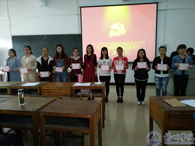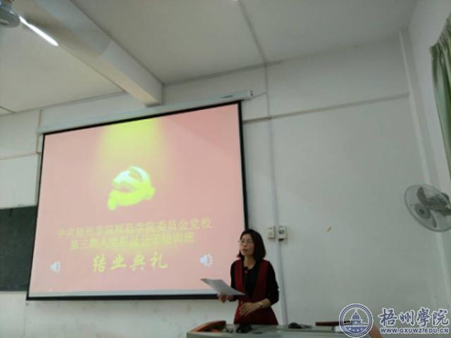 典礼上,主持人宣读了中共梧州学院师范学院委员会党校第三期入党积极分子培训班结业学员名单,祝贺以林莉敏、莫燕、李雪莲等为代表的79名积极分子顺利结业。接下来培训班班主任温丹妮同志为以林莉敏等为代表的10名优秀学员颁发了荣誉证书。典礼接近尾声时,温丹妮分别对培训期间的纪律、课程学习、实践、结业考试等四大方面做了全面而又详细的总结。她希望各位积极分子们保持一颗爱学习的心,端正自己的学习态度和入党动机,正确认识自我,在今后的生活学习中不断进步,提高认识。同时,温丹妮也指出了本次培训班存在的问题和不足,并提出改正指导和建议。
