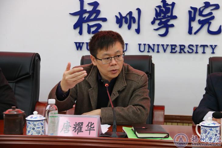 唐耀华结合学校工作实际,从六个方面传达教育部2017年工作要点。一是全面贯彻落实高校思想政治工作会议精神,切实加强教育系统党的建设。深入学习习近平同志的一系列讲话精神;扎实开展体系式学习,生动开展有质量的、能够推动实际工作的融合式讨论,生动开展案例式教学,形成一批高质量的学术研究成果;切实加强学校党的建设;深化全面从严治党;加强教育人才和干部队伍建设。二是全面深化体制机制改革,不断激发教育发展活力。基于学校在创新创业方面走在全国前列的特点,学校应把国家级创新创业示范基地作为今年重要工作去努力争取,从而带动全校工作发展。三是加快优化结构,促进各级各类教育协调发展。学校应紧跟国家的步伐,推动实施应用型高校建设项目,进而搭建应用型高校校企合作平台。四是始终贯彻立德树人根本任务,着力提高教育质量。立德树人的根本任务要落实到中层干部、每一位教师中,改革的落脚点始终是提升人才培养的质量,要转变观念,培养应用型人才。五是大力促进教育公平,切实缩小城乡、区域、校际、群体差距。推进中西部高校教育基础能力建设工程;以教育信息化扩大优质教育资源覆盖面;做好高校毕业生就业创业工作。六是全面提升教育保障水平,维护教育系统和谐稳定。努力培养造就高素质专业化教师队伍,是学校工作的重点,要大力提升教师的专业水平、科研水平和思想道德水平。