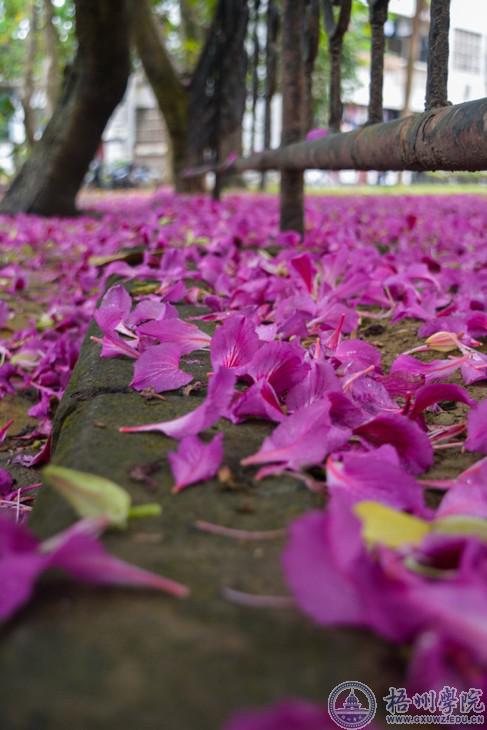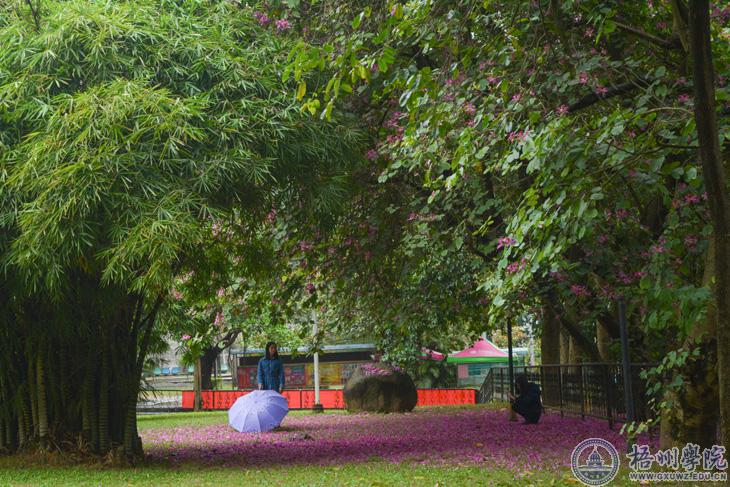 正值早春时节,我校的紫荆花开得灿烂,在体育馆与仁爱湖旁总能见到那一抹紫红和满地的落英,正所谓“繁枝容易纷纷落,嫩蕊商量细细开”。