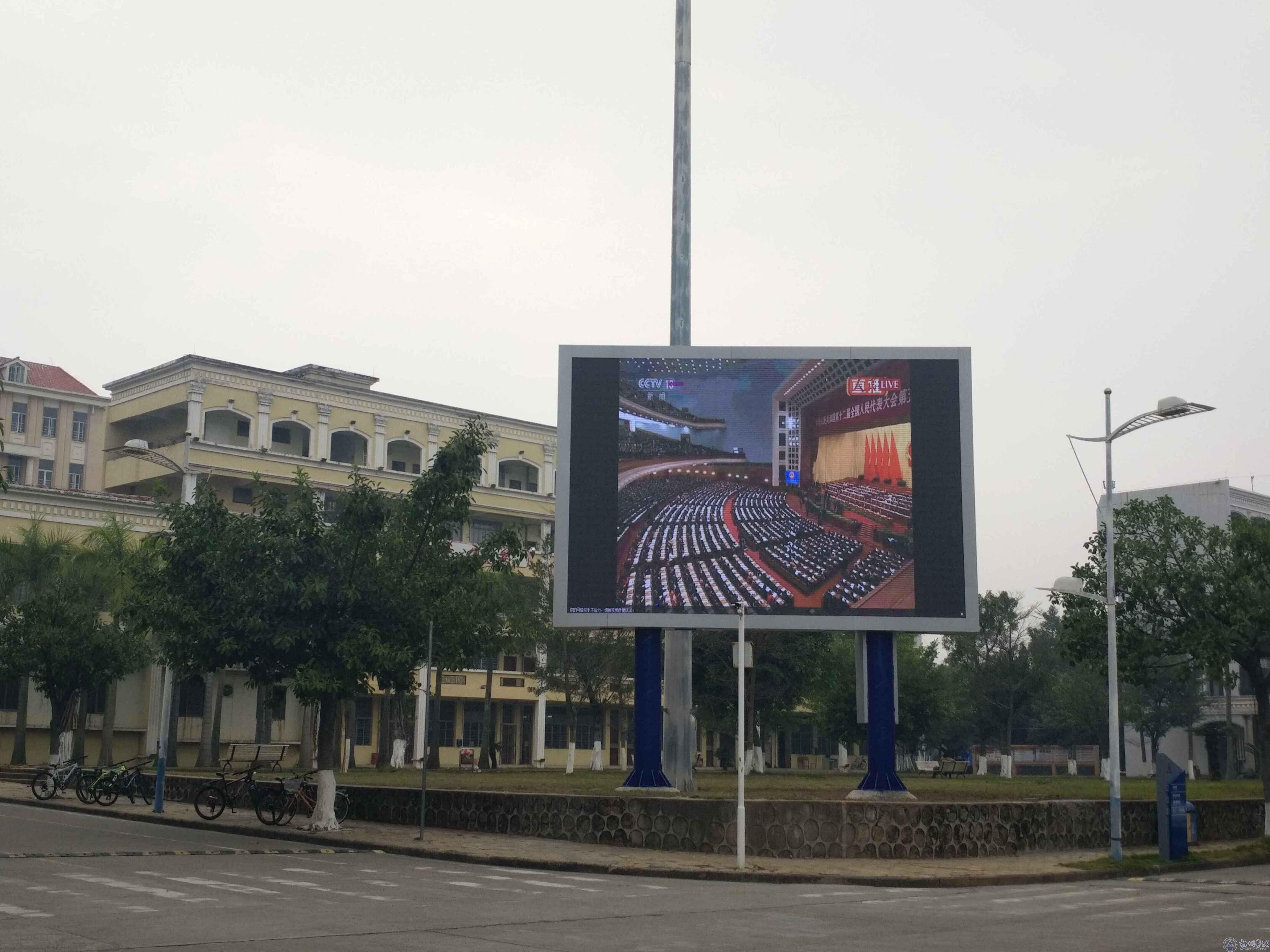 该LED屏幕位于学校主干道十字路口旁,屏幕面积为5M×8M。其建设过程经历了项目设计、招投标、建设、调试等阶段,历时近3个月,投入费用近50万元。现时由学校党委宣传部负责管理。此后,电子电子屏播放内容包括学校新闻摘要,宣传校训校风、反映校园文化的精品视频以及宣传社会主义核心价值观、国家实时政策的新闻、国家的重大会议的直播等。完善之后可以控制定时播放。