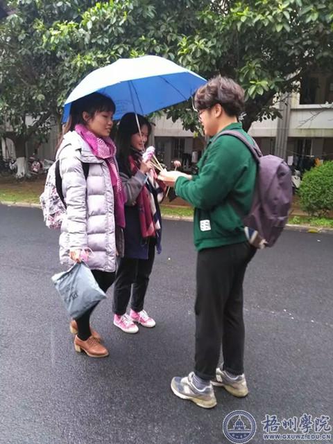 3月7日中午,国际交流学院在A6路口开展了以“梧院男女三比七,我们陪你过三七”和“梧院有女兮,芙蓉如面柳如眉”为主题的女生节活动。学院团委学生会成员现场向路过的各位女生送上节日祝福与小礼物。