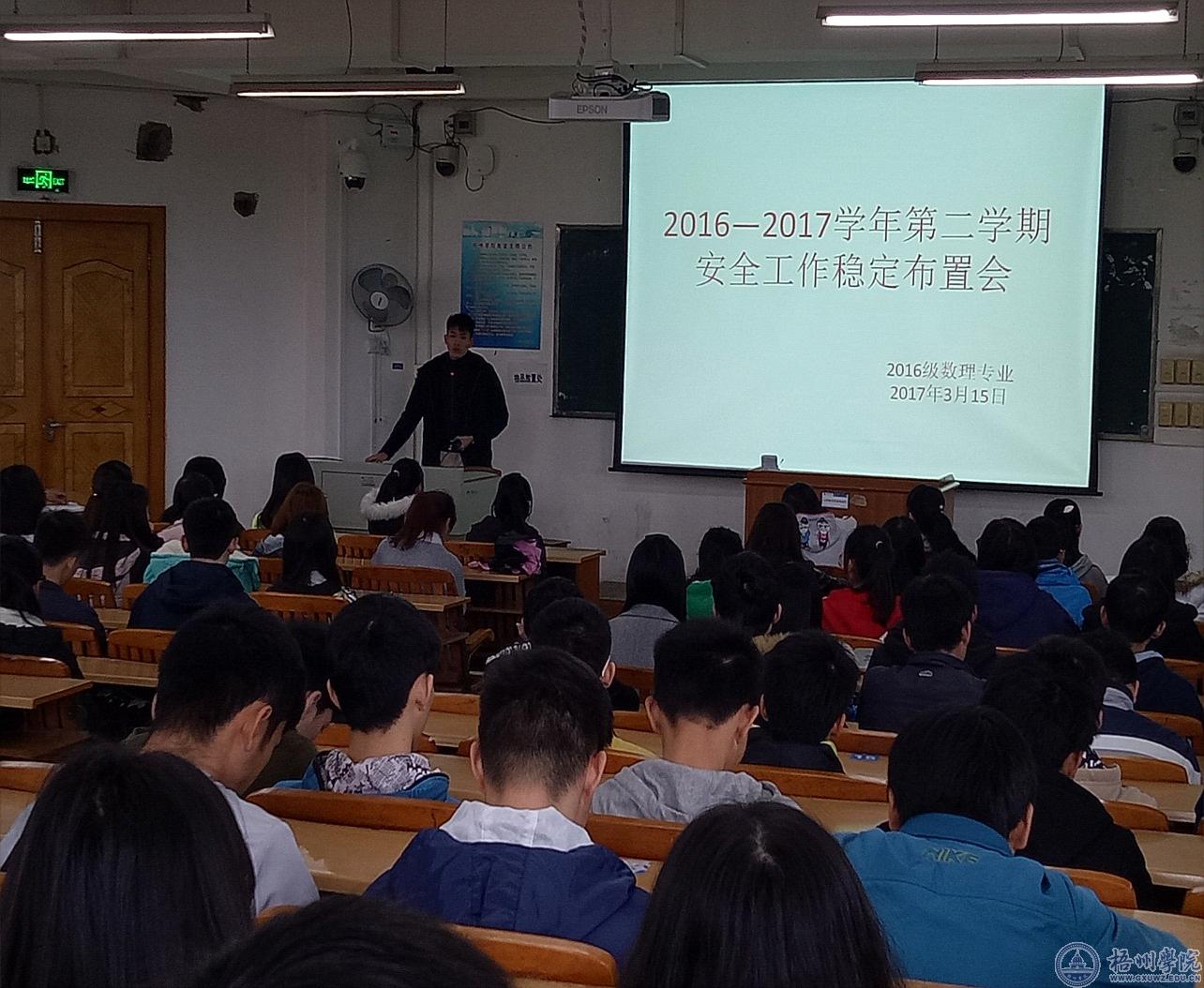 为增强同学们的安全防范意识,提高同学们的安全防范能力,全面贯彻学校2017年安全稳定工作布置会精神。3月15日下午,信息与电子工程学院2016级电子数理专业在明理楼S303召开新学期安全稳定工作布置会。会议由辅导员周源老师主持,他向同学们传达了学校安全稳定工作的相关要求及精神,提醒同学们要树立安全防范意识,时刻维护自身安全。
