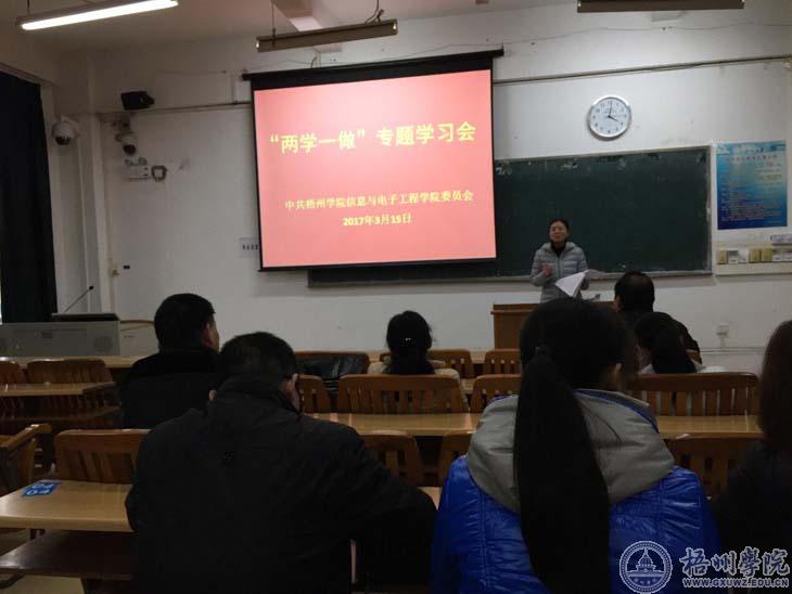 为深入贯彻党的十八届六中全会精神,进一步推进“两学一做”学习教育,增强党员的政治意识、大局意识、核心意识、看齐意识。3月15日下午,信息与电子工程学院党委在明理楼S302教室组织全体党员开展了《关于新形势下党内政治生活的若干准则》和《中国共产党党内监督条例》等专题学习。