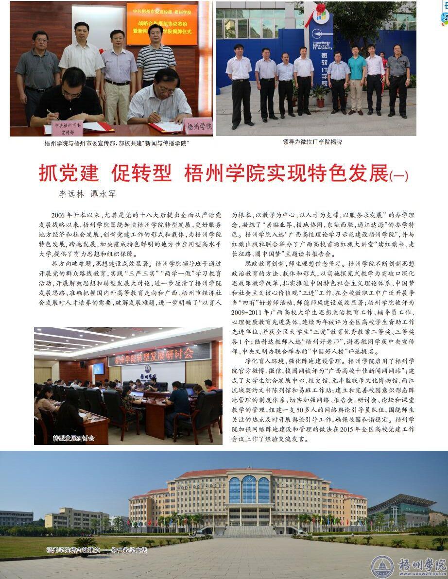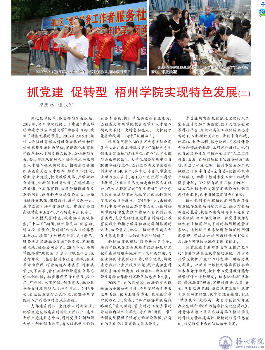 | 2006年升本以来,尤其是党的十八大后提出全面从严治党发展战略以来,梧州学院围绕加快梧州学院转型发展,更好服务地方经济和社会发展,创新党建工作的形式和载体,为梧州学院特色发展, 跨越发展,加快建成特色鲜明的地方性应用型高水平大学,提供了有力思想和组织保障。