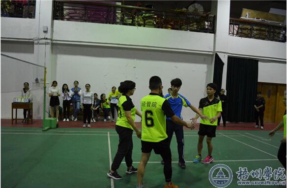 比赛一开始,经管学院就势如破竹的连拿下6分,之后一直保持场上优势并将比分继续扩大。经过两轮角逐,经管学院与宝艺学院的比分为21:16和21:13,经管学院取得了比赛的首场胜利。比赛过程中全体运动员都以饱满的热情和昂扬的斗志投入到比赛中,运动员能服从安排,服从判决,赛场外的啦啦队全程为运动员加油呐喊,整个比赛现场十分激烈。