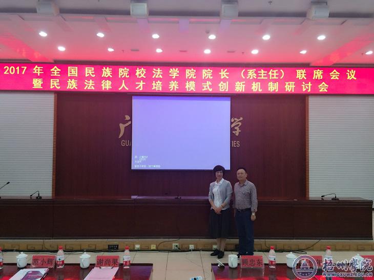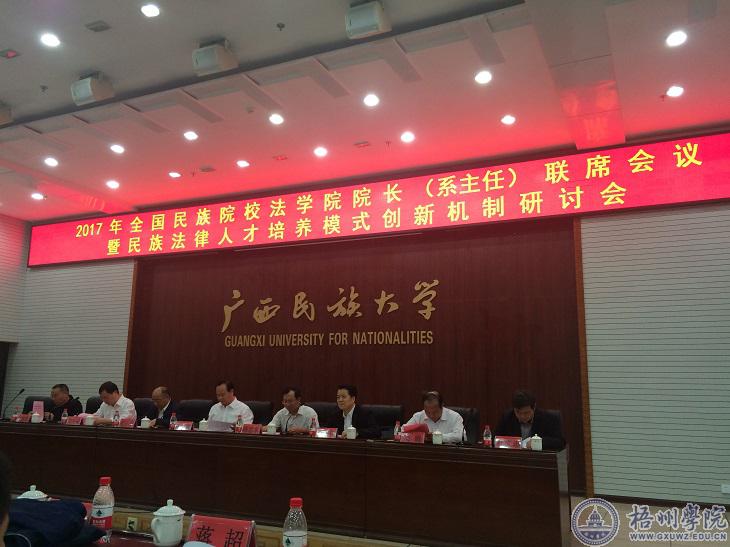 为探讨民族地区法律人才培养新模式,2017年4月16日至4月18日,全国民族院校法学院院长(系主任)齐聚广西南宁,围绕“民族地区法律人才培养模式创新”这一主题,在广西民族大学隆重举行了全国民族院校法学院院长(系主任)联席会议。我校文法学院莫敏院长、法学教研室主任骆庆国教授应邀参会。