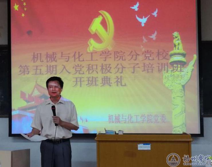 2017年4月17日,机械与化工学院第五期入党积极分子培训班在北楼403举行,本次培训班共有122名入党积极分子参加。机化学院党委书记、党校校长陈金辉,党委副书记、党校副校长韦衡冰等领导参加了开班仪式。陈金辉书记在开班仪式结束后,为学员们讲授了第一堂课——《端正入党动机 早日站在党旗下》。