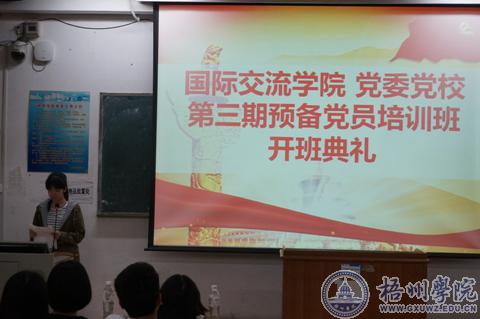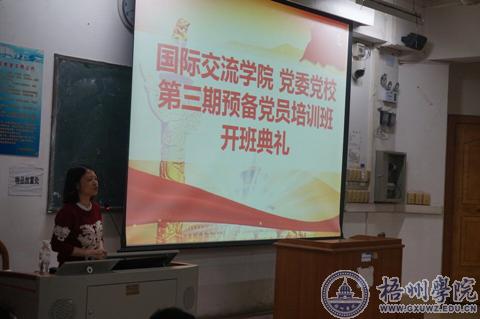 2017年4月14日晚,国际交流学院党委党校第三期预备党员培训班开班典礼与开班第一课在明理楼s303启动。参与本期培训班的学员有国际交流学院2014级全体预备党员及第四期入党积极分子。学院党委书记莫世有、副书记冀宁、学生第二党支部书记吴茜出席了本次典礼。