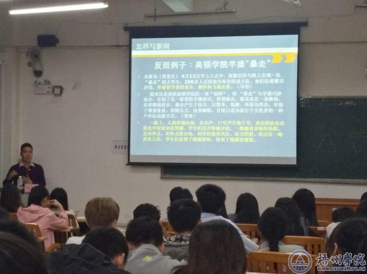 学校党委宣传部宣传教育科科长郑文锋老师学员们讲授宣传工作专业知识,他指出,新、事实、报道是新闻的三要素,消息的定义是以简明的文字迅速及时地报道新闻事实的一种新闻最基本载体,其它都是作为消息的补充、延伸而发展起来的。他还分析了新闻的重要性、显著性、接近性、趣味性、新鲜性特征,并运用案例对新闻报道存在的口语化,形容词多,语病等问题提供了一些处理方法,让作者在写新闻报道时运用更多的动词,生动表达现场的氛围。