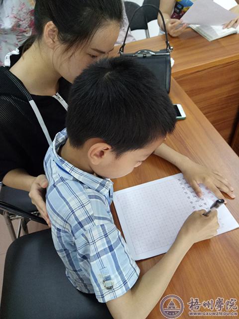 教员们一对一地进行“手把手”教学,教员们先教小朋友们握笔的姿势、坐姿,以及基本笔画等,讲解之后小朋友们就认真地开始了各自的临摹练习。教员们鼓励小朋友要多多练习才能写得一手好字。