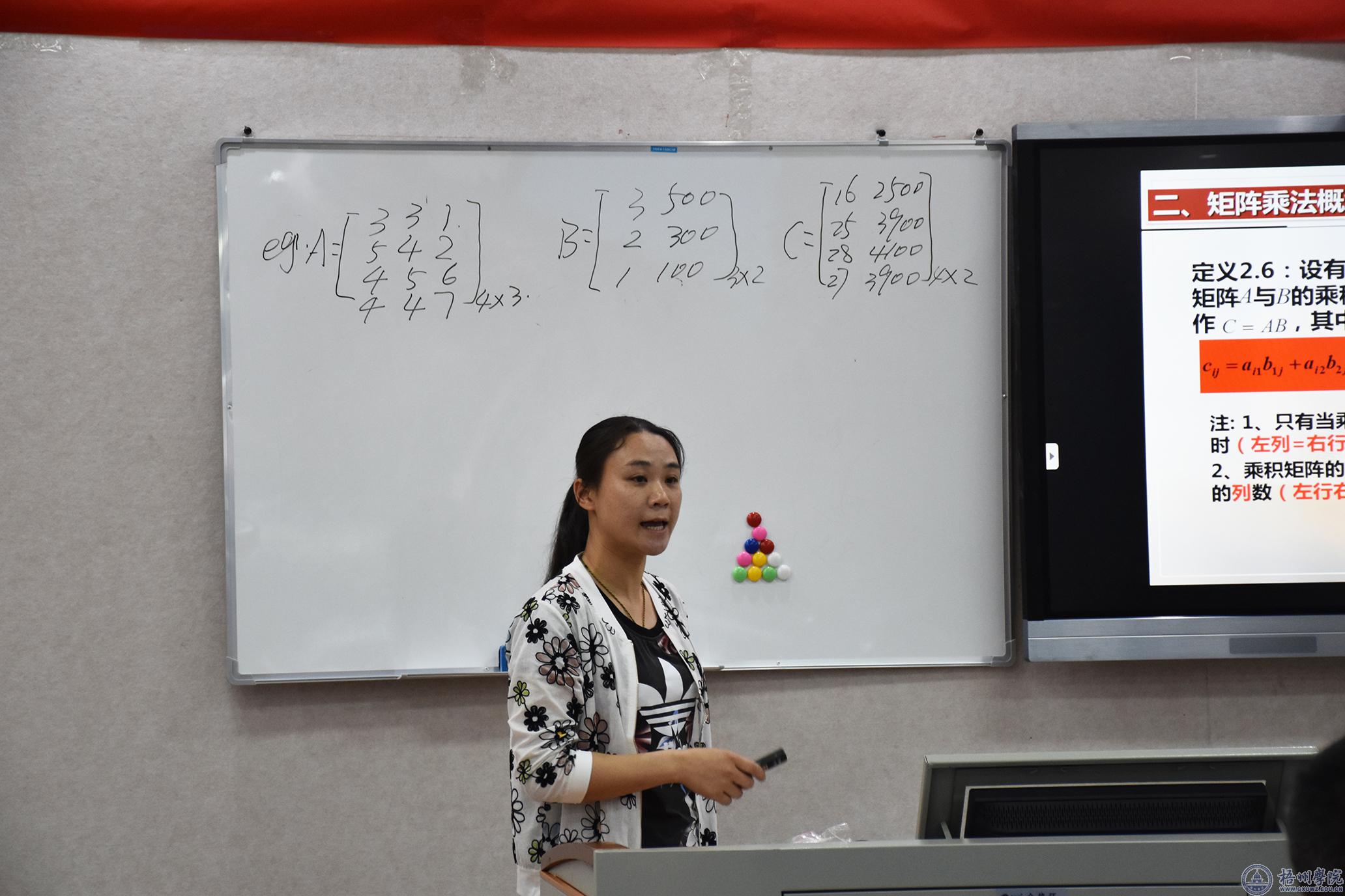 5月12日晚举行了第一场自然科学组的教师竞赛,邀请了梁文忠、时伟、黄燕钧、杨红梅、董燕五位老师做评委,教务处副处长时伟任组长。本组共6名选手,获得前三名的均是来自信息与电子工程学院的老师,赵贤老师以92.27分获第一名。模拟课堂上,她讲的课程是“矩阵乘法”,先用引例引出矩阵乘法的定义,再将定义运用到实例中。赵贤老师将引例放出来后并没有直接将答案直接公布在电子版上,而是在白板上一边列式子一边讲解题思路,一步一步地引导学生学习。她用自己独特的音色,响亮而不失柔和的声音攥住学生的注意力,偶尔还用“你看”“对吧”这些词将学生视线带回题目,课堂的最后她用一个“路径选取”的实例将所讲授知识运用到实际生活中。其后她在教学反思中提到:学生往往觉得“矩阵乘法”难以运用到实际中,数学很难与实际联系起来,而这样的教学设计可以更好地帮助他们理解知识和学会运用知识。