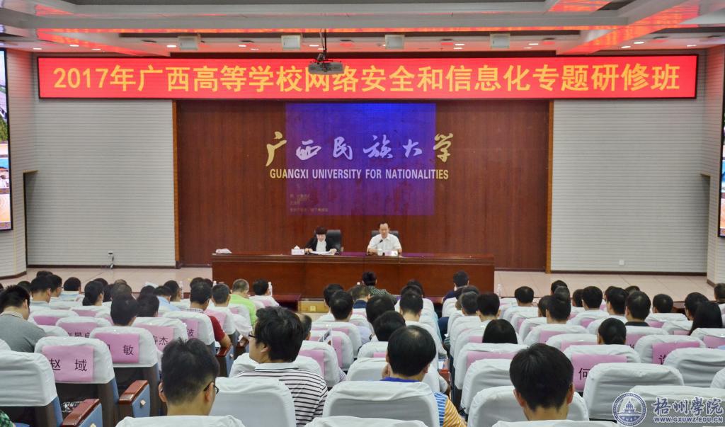 5月11日上午,林基明副校长带领现代教育技术中心负责人一行参加2017年广西高等学校网络安全和信息化专题研修班。该研修班在广西民族大学科技楼报告厅开班,旨在加强广西各高校网络安全和信息化建设水平。