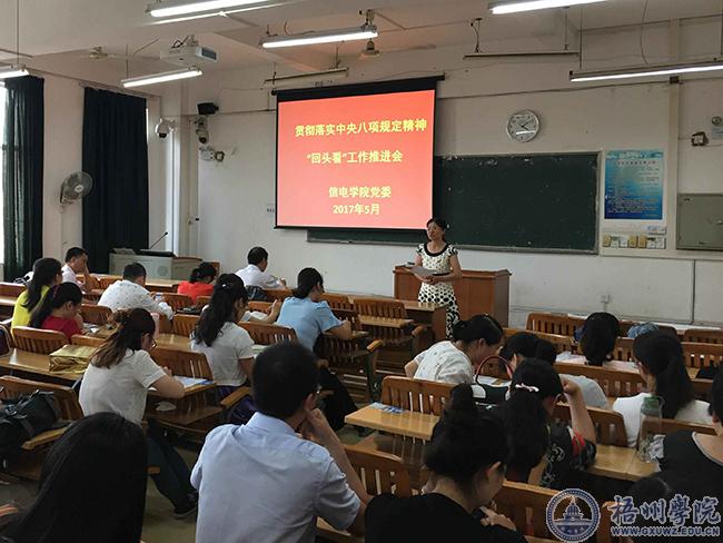 5月24日下午,信息与电子工程学院在明理楼S302教室召开贯彻落实中央八项规定精神“回头看”工作推进会。学院领导班子以及全体教职工参加会议,会议由院长甘金明主持。