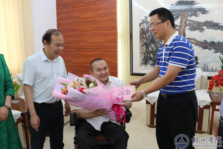 黄恩向郑明博士表达了市委、市政府的祝福和问候,并感谢我校奋战在一线的科研工作者对梧州市社会经济文化做出的贡献。他仔细询问了郑明近来的工作和生活情况,鼓励郑明博士及我校科研工作人员扎实做好科研,借助梧州学院这一平台,不断提高教学和科研的能力,为梧州学院争光,为梧州的城市发展增添动力。