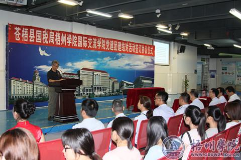 签约仪式上,国际交流学院党委书记莫世有发言说:通过开展党建团建结对共建活动,增强党建团建的工作活力。也以此为契机,向苍梧县国税局学习和交流,使师生能够更加了解税法和维护税法。