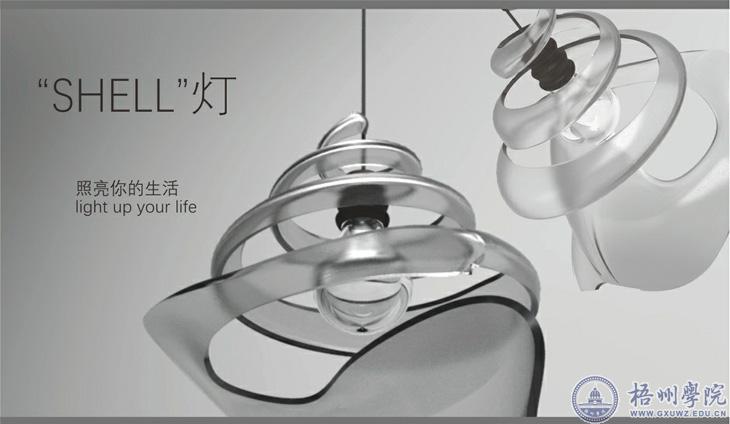 《SHELL灯》的设计过程可以说是一波三折。一开始,赖玲玲设计的产品并不是吊灯,但随着驱蚊器和落地灯这两个设想都被老师否定后,她接受了老师的建议,选择了形式多样化的吊灯作为设计对象。在赖玲玲的设想中,吊灯要尽可能的还原海螺的形态和质感,但具体操作的过程中却不尽如人意。不管是一开始选择的木材还是后来选择的磨砂塑料,渲染出来的效果并没有想象中的好,略显笨重,没有海螺的优美感。在多番尝试后,她才决定选择透明玻璃,但问题也随之而来。由于渲染的材质是透明玻璃,在PS里抠图时与背景融为一体,且吊灯的中间有缝隙,更是加大了难度。“单是抠图这一环节,我就花了整整一天,比建模的时间还长。”赖玲玲说。