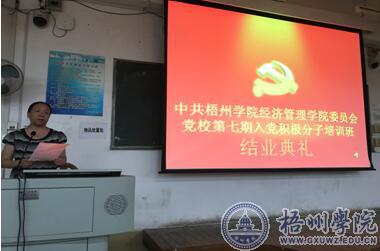 6月8日下午,中共梧州学院经济管理学院委员会党校第七期入党积极分子培训班结业典礼在明理楼s303顺利举行。经济管理学院党委书记、党校校长雷飞同志,党委宣传委员兼本期培训班班主任冼春妮等同志以及本次培训班全体成员出席了结业典礼。结业典礼由优秀学员黄美琪同学担任主持。