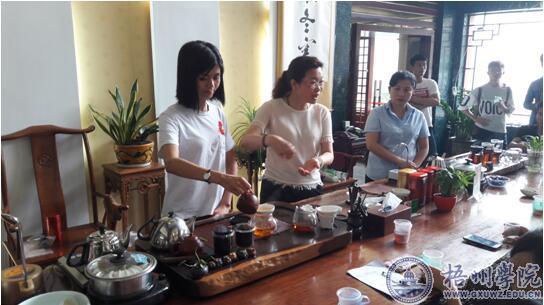 师生一行在梧州茶厂何梅珍副厂长的陪同下首先来到了梧州茶厂生产车间参观。他们详细了解了六堡茶的发展历程、茶叶生产制作流程,深刻感受到了六堡茶博大精深的文化内涵以及梧州茶厂三鹤六堡茶文化的独特魅力。茶艺师优雅地向师生们展示了六堡茶的工夫茶艺,得到大家的热烈鼓掌和赞赏。