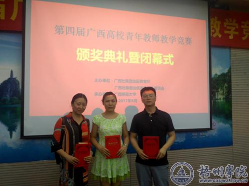近日,由自治区教育厅和自治区教育工会联合举办,广西师范大学承办的第四届广西高校青年教师教学竞赛在广西师范大学举行。本次竞赛共有来自全区各个高校的100名老师参加比赛。经过激烈角逐,我校信电学院梁菁老师荣获自然科学基础学科组一等奖;信电学院郑瑶老师荣获自然科学应用学科组二等奖;经管学院王泽兵老师荣获人文社会科学组二等奖。“一金两银”的成绩是我校老师在该项赛事中继上届取得3个二等奖后的再次突破。