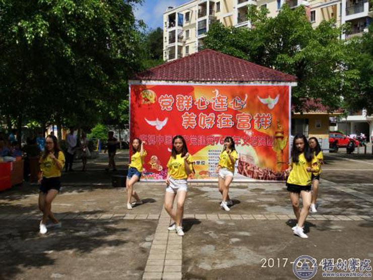 慰问活动结束之后,富祥社区联合双报到单位举行“党群心连心,美好在富祥”为主题的“迎七一”文艺演出活动。机化学院的学生表演了独唱《成都》、舞蹈《super star》和合唱《中国青年志愿者之歌》将大学生的激情与奉献展现得淋漓尽致,得到了观众的一致好评。