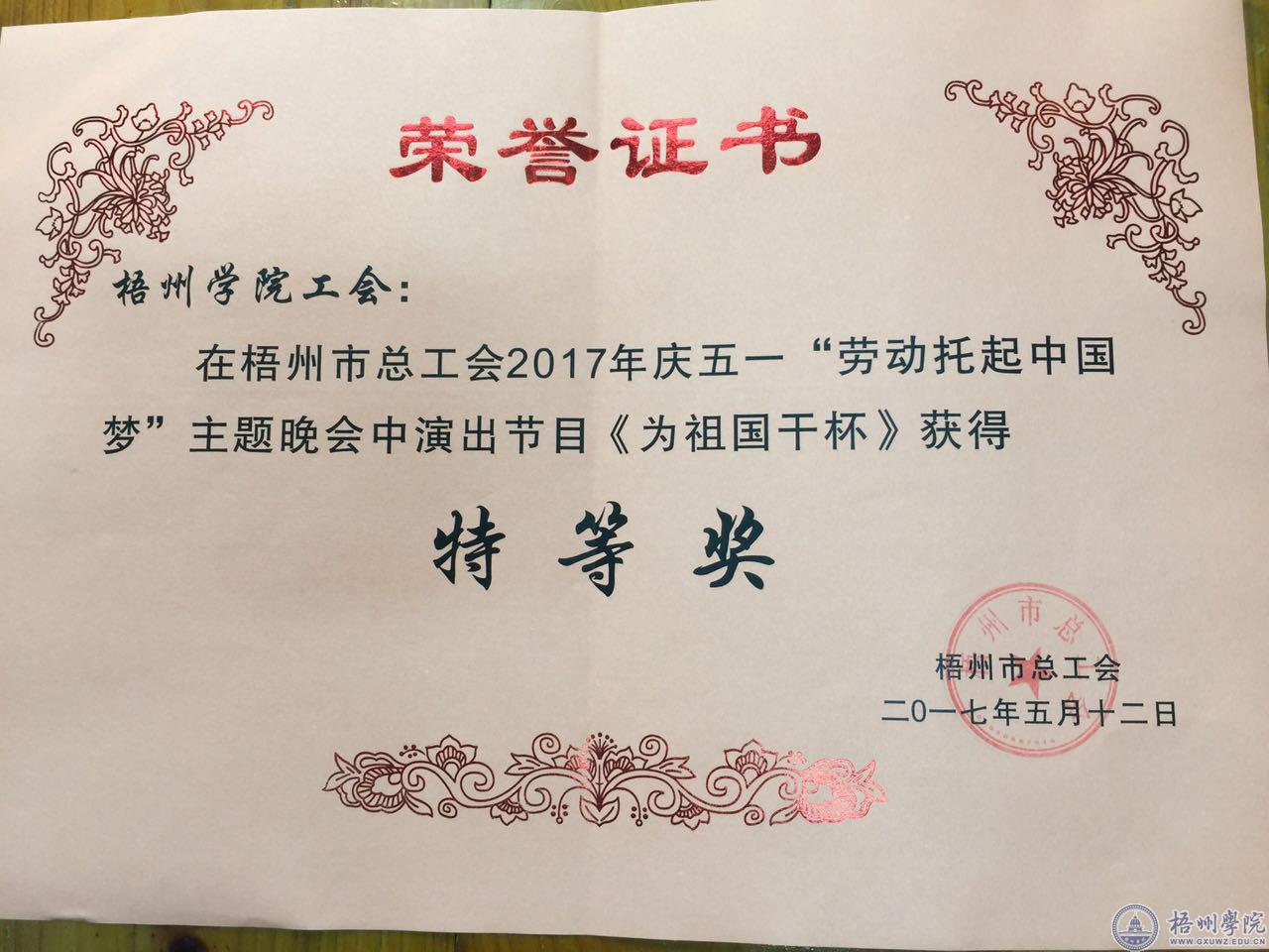 为庆祝“五一”国际劳动节,梧州市总工会于4月27日晚在文化中心剧场举办“劳动托起中国梦”主题晚会,晚会得到了各县市、城区工会的大力支持,经由市群艺馆评委评选,选出特等奖3名,一等奖3名,二等奖4名。我校工会参演的歌伴舞《为祖国干杯》得到了评委和观众的一致好评,最终以绝对优势获得了特等奖第一名的好成绩。