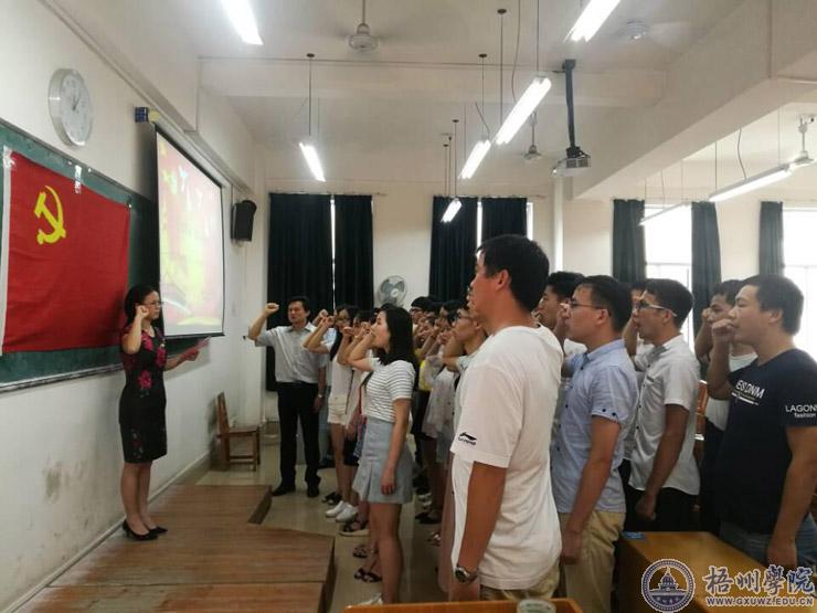 机化学院党委副书记韦衡冰带领党员们重温入党誓词,全体党员面对鲜艳的党旗,举起右手,再次郑重地宣读了入党誓言:“我志愿加入中国共产党,拥护党的纲领,遵守党的章程,履行党员义务……”,铿锵有力的声音再次回荡在每一位党员的心中。