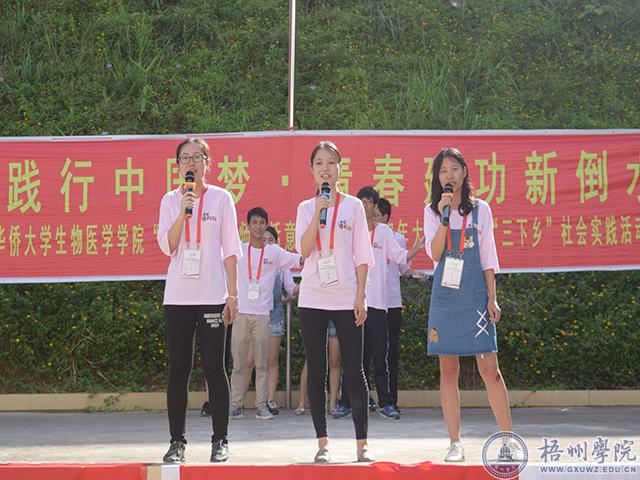 7月16日上午,“医往情深•师情话意”教育关爱服务团在梧州市长洲区倒水镇倒水中学操场开展了汇报演出。倒水中学团委书记岑柱陶、梧州学院师范学院团委书记莫伍珠出席了本次活动,服务团的全体教员、兴趣班学员以及部分学生家长共计200余人观看了汇报演出。