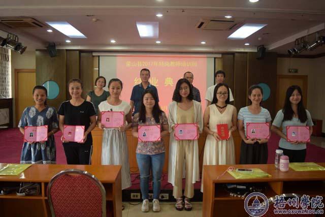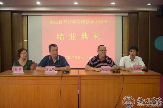 2017年8月17日,由梧州学院师范学院承办的蒙山县2017年特岗教师培训班在梧州大酒店会议中心举行结业典礼。蒙山县教育局人事股黄茂荣主任、梧州学院师范学院谢龙华副院长等人以及蒙山县的39名特岗教师学员参加了结业典礼。至此,为期一周的蒙山县2017年特岗教师培训理论集训在今天落下帷幕。