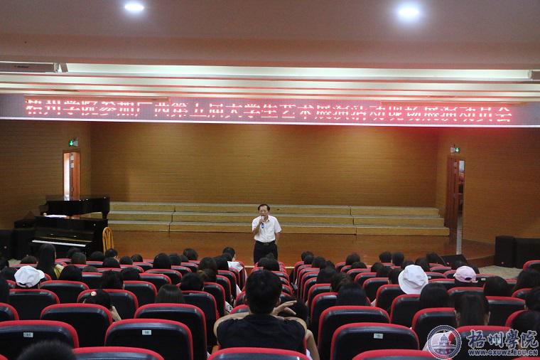 8月24日上午,梧州学院参加广西第五届大学生艺术展演活动现场展演动员会在北校区实验楼五楼音乐厅举行,副校长邱房贵、校团委副书记李德华,以及各参演节目的指导老师和学生共160多人参加了动员会。