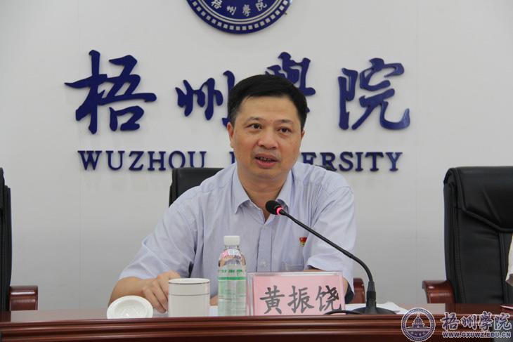 黄振饶表示,梧州市委市政府将一如既往大力支持梧州学院升格为大学,并针对存在的主要问题进行解决,对学校申报自治区重大科研项目给予帮助和支持。他强调,要加强推进校地协同育人,学校要集合社会的力量,为学生提供更多的发展平台,加强学生社会实践能力。
