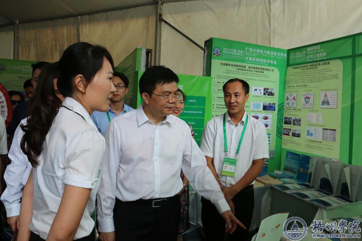 我校两个项目“产教融合 多元协同 创新协同育人新机制——软件工程专业建设成果”、“纸币收展平分拣计数器”参加了此次展览。展览期间,自治区高校工委副书记(正厅级)秦敬德、教育厅副厅长黄雄彪等领导先后到我校展台听取了项目介绍,并对项目给予了肯定。