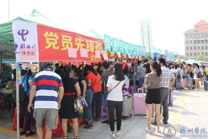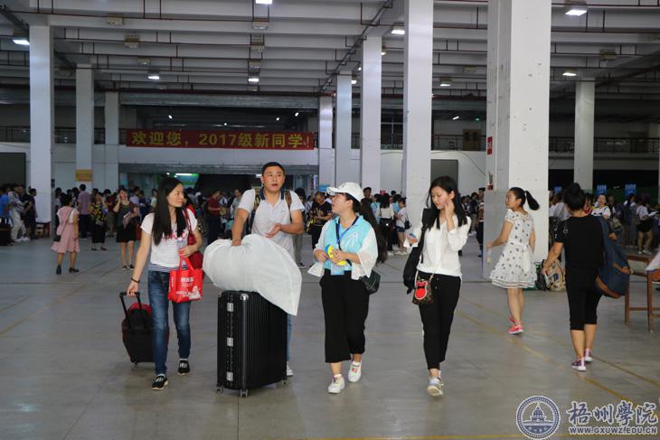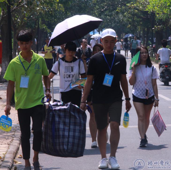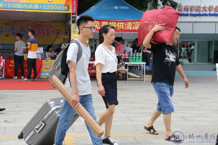 2017级信息与电子工程学院电子信息工程班的石晨和母亲从安徽坐了22个小时的火车来到梧州,迎新工作人员从石晨妈妈背上接过大包行李。