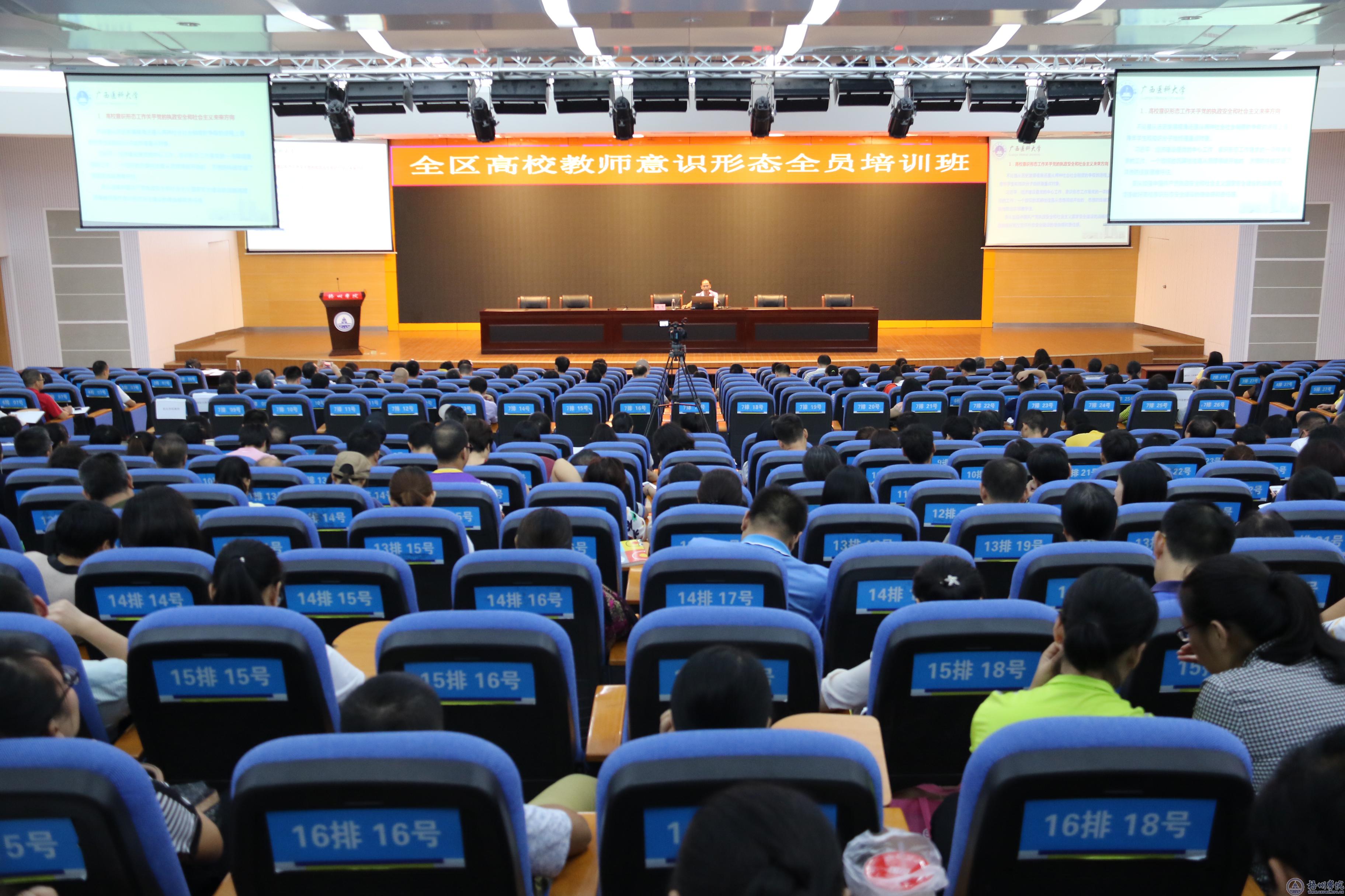 9月20日,全区高校教师意识形态教育全员培训班在我校学术报告厅开班,广西医科大学人文社会科学学院院长陈飞教授与广西师范大学马克思学院副院长靳书君教授出席并授课。我校专兼职教师、辅导员及梧州职业学院教师共500多人参与。培训班由我校党委宣传部部长陈健萍主持。