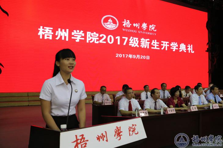 “几日前,我一个人背上行囊,从河南来到梧州。我虽远离家乡,但我并不孤单,因为我明白,我们拥有老师和学长学姐们最诚挚的关爱。”来自信息与电子工程学院2017级电子信息工程本科3班姬潇洒代表新生发言。“生活不只有苟且,还有诗和远方”。他希望新生们能脚踏实地学习,走出一条精彩纷呈的大学之路。四年后再回望这段难忘的岁月时,能够问心无愧地说:青春无悔!