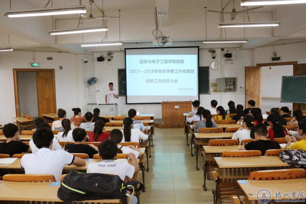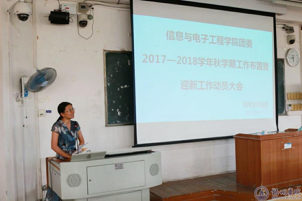 为做好本学期学院团委工作,同时确保迎新接待工作有序开展,信息与电子工程学院团委于2017年9月13日下午,在明理楼s503教室召开了2017—2018学年上学期工作布置暨迎新工作动员大会。信电学院党委副书记吴燕端、团委指导老师周源、全体学生干部以及部分迎新志愿者代表参加会议。