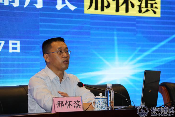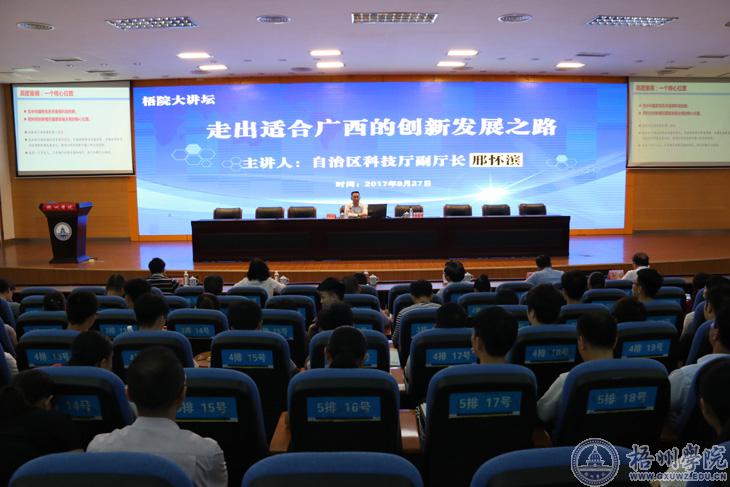 9月27日下午,自治区科技厅副厅长邢怀滨受邀到我校,在明理楼一楼学术报告厅为我校师生作了“走出适合广西的创新发展之路”的专题报告会。学校领导唐平秋、玉振明、林基明,各二级学院院长、分管科研工作的副院长以及各二级学院教师代表及学生代表300多人听取了专题讲座。学校副校长林基明主持报告会。