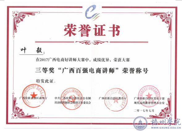 2017年7月,在自治区商务厅、自治区非公经济组织和社会组织党工委、自治区教育厅与自治区党员干部现代远程教育管理办公室联合主办的2017广西电商好讲师大赛中,我校经济管理学院电子商务教研室叶毅老师荣获三等奖“广西百强电商讲师”荣誉称号,2016年,他还获得了自治区商务厅特聘“广西电子商务讲师团”讲师资格。