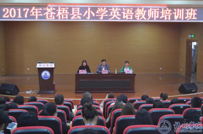 10月16日,师范学院首次承办的2017年苍梧县小学英语教师培训班在音乐报告厅举行了开班仪式。苍梧县教育局师训股主任于丽、师范学院院长邬跃生、英语系主任邹燕以及苍梧县各乡镇136名小学英语教师参加了开班仪式。