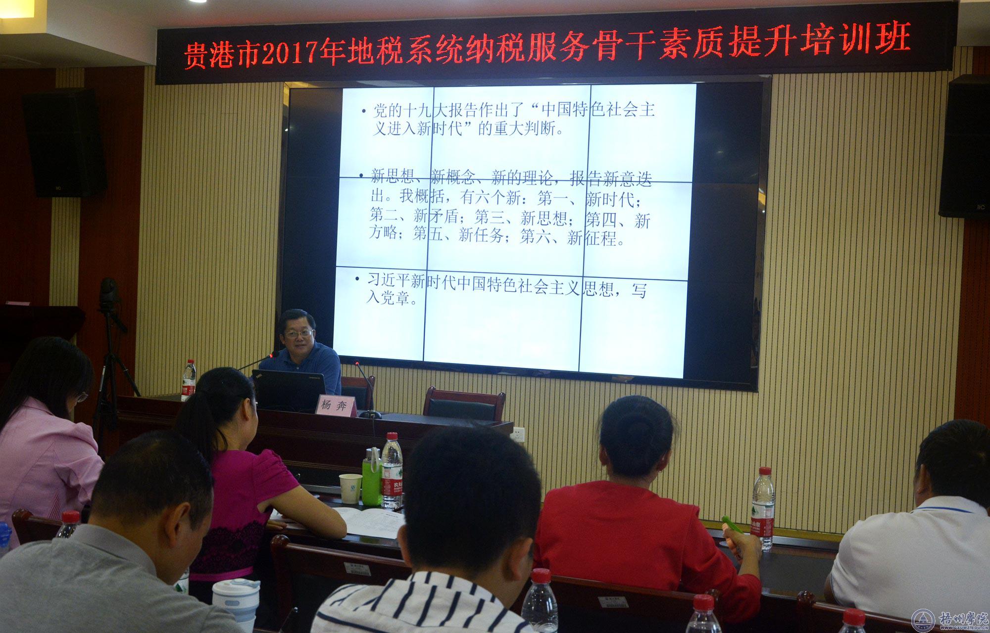 据悉,贵港市地税系统2017年纳税服务骨干素质提升培训班是杨校长牵线搭桥、继续教育学院承办的一期培训班。杨校长为该培训班作首场专题培训,随后唐景成等老师将从《党的十九大精神解读》、《廉政风险防范》、《课件制作》等内容作专题培训。本期培训班于10月23日下午开班,将于10月27日结束,培训学员50人。