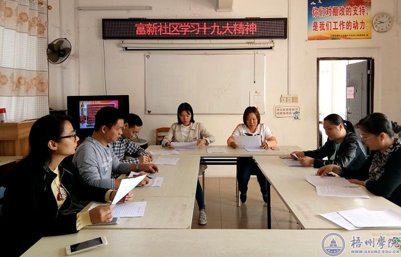 2017年11月3日,梧州学院职成继教院党支部派副书记刘豪,走进市万秀区富新社区,参加富新社区“学习党的十九大精神”的主题活动,与社区的同志一起学习党的十九大精神,以丰富多样的形式度过了一个生动的主题党日。活动议程有以下三个: