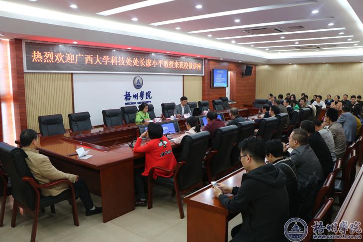 11月18日下午,广西大学科研处处长廖小平教授受邀在我校明理楼八楼大会议室为我校教师作题为“基金项目的选题策划以及申请书编写解析”的专题讲座会。学校副校长玉振明主持讲座。科研处主要领导、学校各职能部门相关教师70余人参加了讲座。