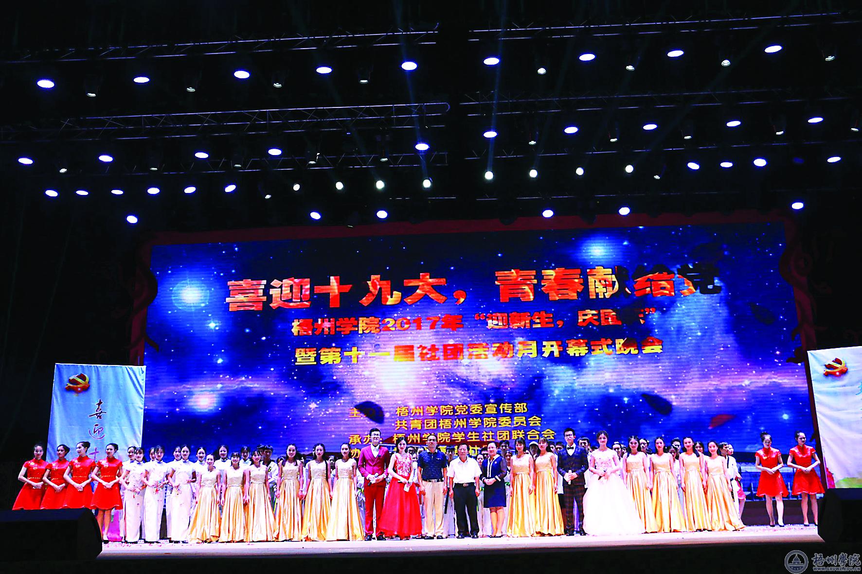 今年9月29日,第十一届社团活动月正式开始,由学校党委宣传部、学校团委主办,社团联合会承办,各社团协办的主题为“喜迎十九大,青春献给党”――梧州学院2017年“迎新生,庆国庆”暨第十一届社团活动月开幕式文艺晚会在体育馆三楼成功举办,这次的文艺晚会上共有十二个节目呈现给观众,包括声乐、舞蹈、朗诵、武术等表演形式。共有47个社团参与其中,多种形式的表演体现了社团类型的多元化和高活跃度,也展现了大学生们多才多艺的一面。《The hope》、《跆之风,道之魂》和《武术风云》等节目给观众丰富的视觉效果,展现了大学生们青春活力的状态。《党旗下》、《今天是你的生日,中国》两个节目表达了青年们对党的无限崇敬之情和强烈的爱国心。这些优秀的社团活动给校园文化增光溢彩。