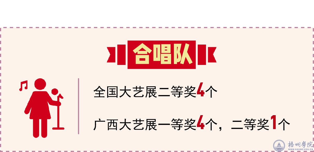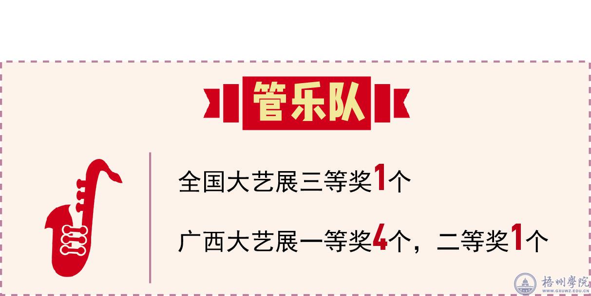 梧州学院学生艺术团(原广西大学梧州分校大学生艺术团)成立于2003年,至今已有14年的历史。艺术团成立以来,一直活跃在校园和当地文化舞台上,为陶冶学生情操、活跃校园文化和当地建设等方面做出了积极贡献。艺术团共设有管乐队、合唱队、舞蹈队,礼仪队和茶艺队五个队伍,由学校团委管理和指导,曾应邀参加越南、泰国十多所高校的艺术文化交流活动,还经常代表学校参加各级各类文艺比赛和交流活动,并在广西大艺展和全国大艺展中取得突出的成绩,是学校艺术形象的使者和文化的传播者。