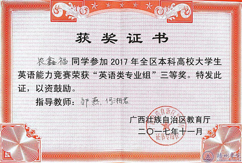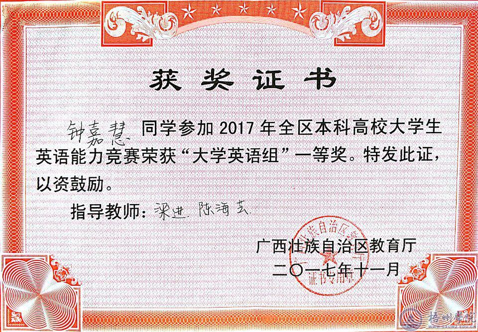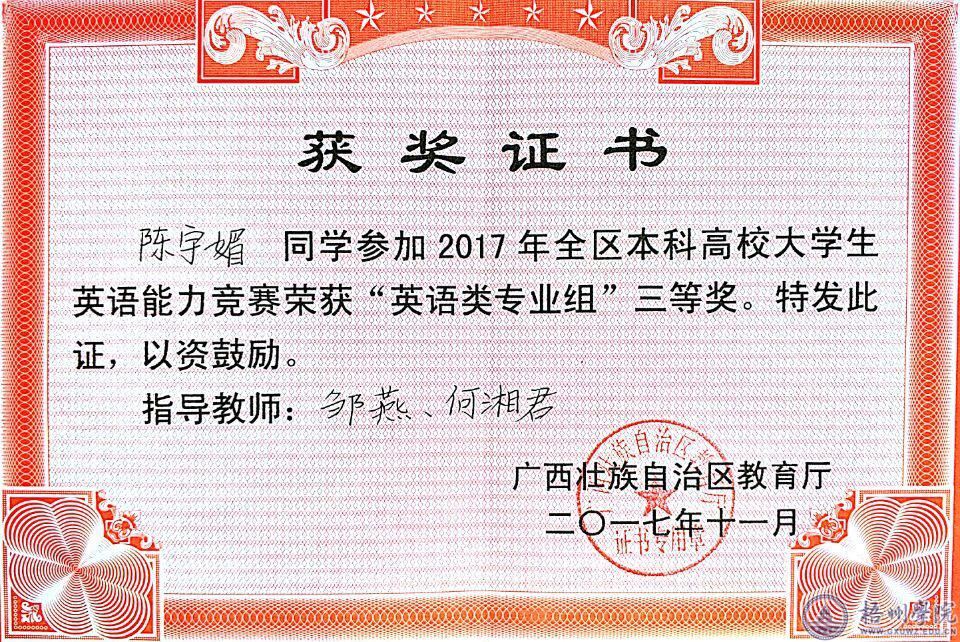 12月23日至24日,2017年广西本科高校大学生英语能力竞赛(GECCCS:Guangxi English Competence Contest for College Students)在桂林电子科技大学举行。我校师范学院2016级小学教育钟嘉慧首斩大学英语组一等奖,师范学院15级英语班陈宇媚、国际交流学院14级翻译班农鑫福获英语专业组三等奖。同时,我校荣获优秀组织奖。