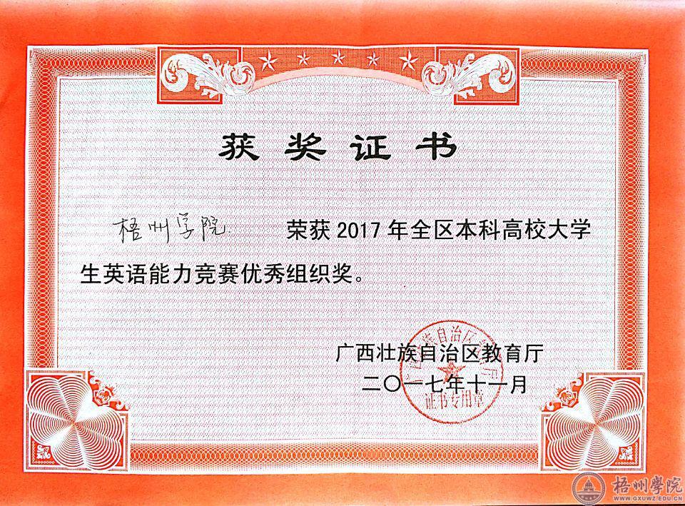 此次竞赛由广西壮族自治区教育厅主办、广西本科高校英语教学指导委员会和桂林电子科技大学承办,来自区内34所本科院校124名选手展开激烈角逐。大赛分为英语专业组和大学英语组,包括笔试和口试,具体内容为阅读、写作、翻译和演讲,综合考核选手的英语听、说、读、写、译等能力,其难度和激烈程度均大于以往的英语类单项竞赛。本次获奖是我校大学英语在综合性竞赛中的首次突破,也是我校首次获得英语竞赛优秀组织奖。我校大学英语教学改革初现成效。