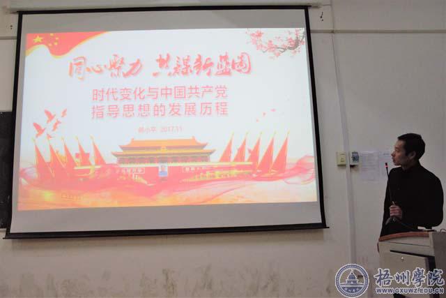 第一节课由师范学院党委副书记韩小平同志主讲,此次课程的内容是:时代变化与中国共产党指导思想的发展历程。韩书记的讲课朴实生动、深入浅出,让学员们对中国共产党从一大到十九大指导思想的发展有了进一步的了解与思考,同时学员们也明确了自己的责任与义务。
