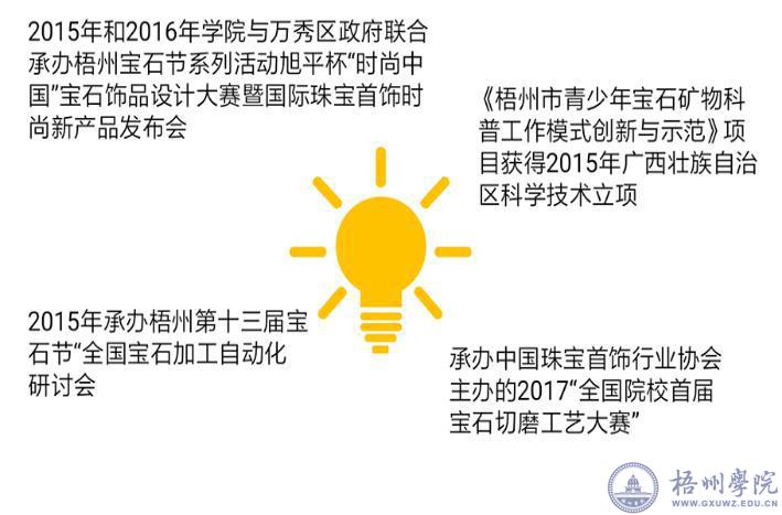 学院影响力与校地协同能力显著上升。以宝艺学院高级工程师为带头人研发的系列人工宝石自动化设备,对梧州市人工宝石产业升级起直接推动作用。师生团队为梧州六堡茶、珠宝类企业、团体以及活动的形象设计、场馆设计方案多项被采用。
