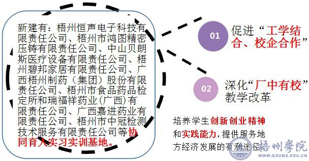 学院坚持以“以育人为根本、以人才为支撑、以教学为中心、以服务求发展”的办学理念,响应国家“大众创业、万众创新”政策,紧贴业界,校地协同,加快转型发展,以“1+1+N”(梧州学院+梧州工业园区管理委员会+合作单位)的模式,在梧州市工业园星华小区搭建梧州学院创新创业孵化基地。